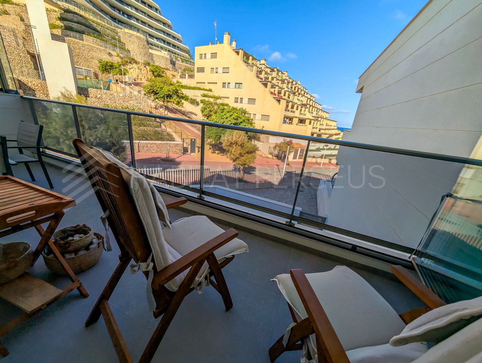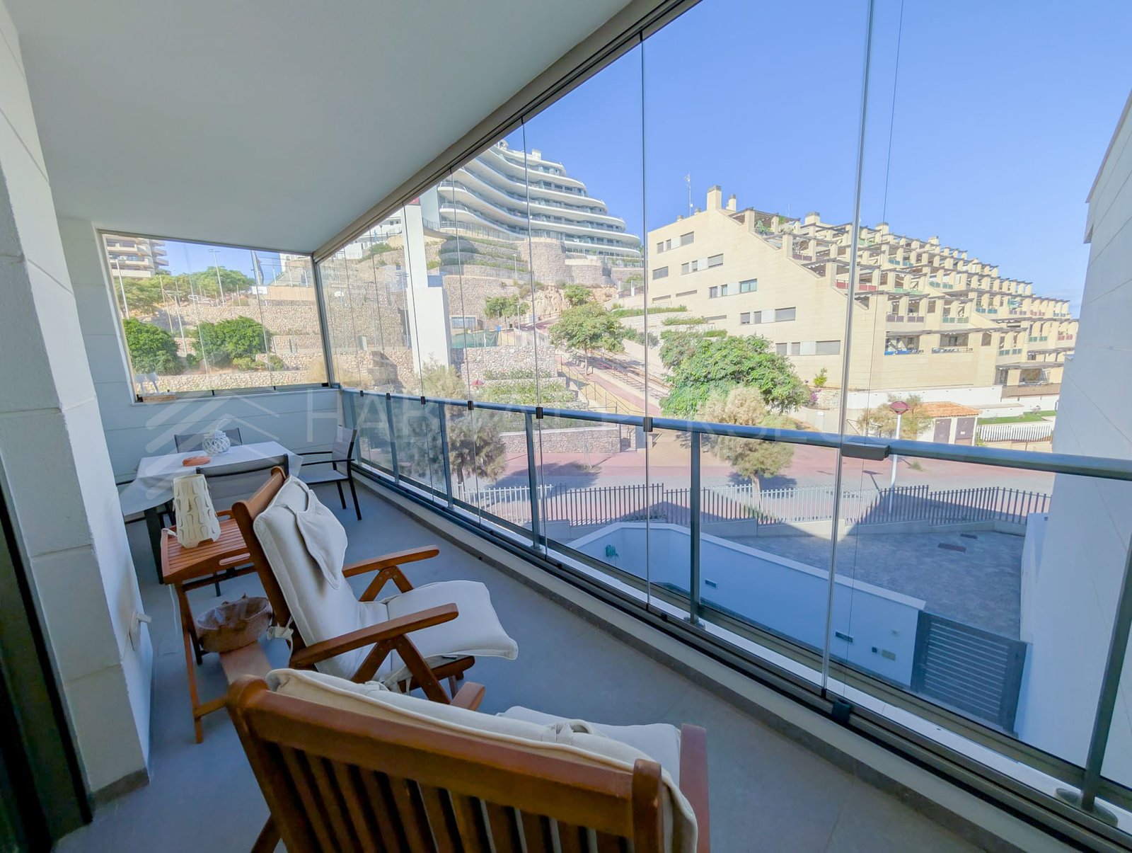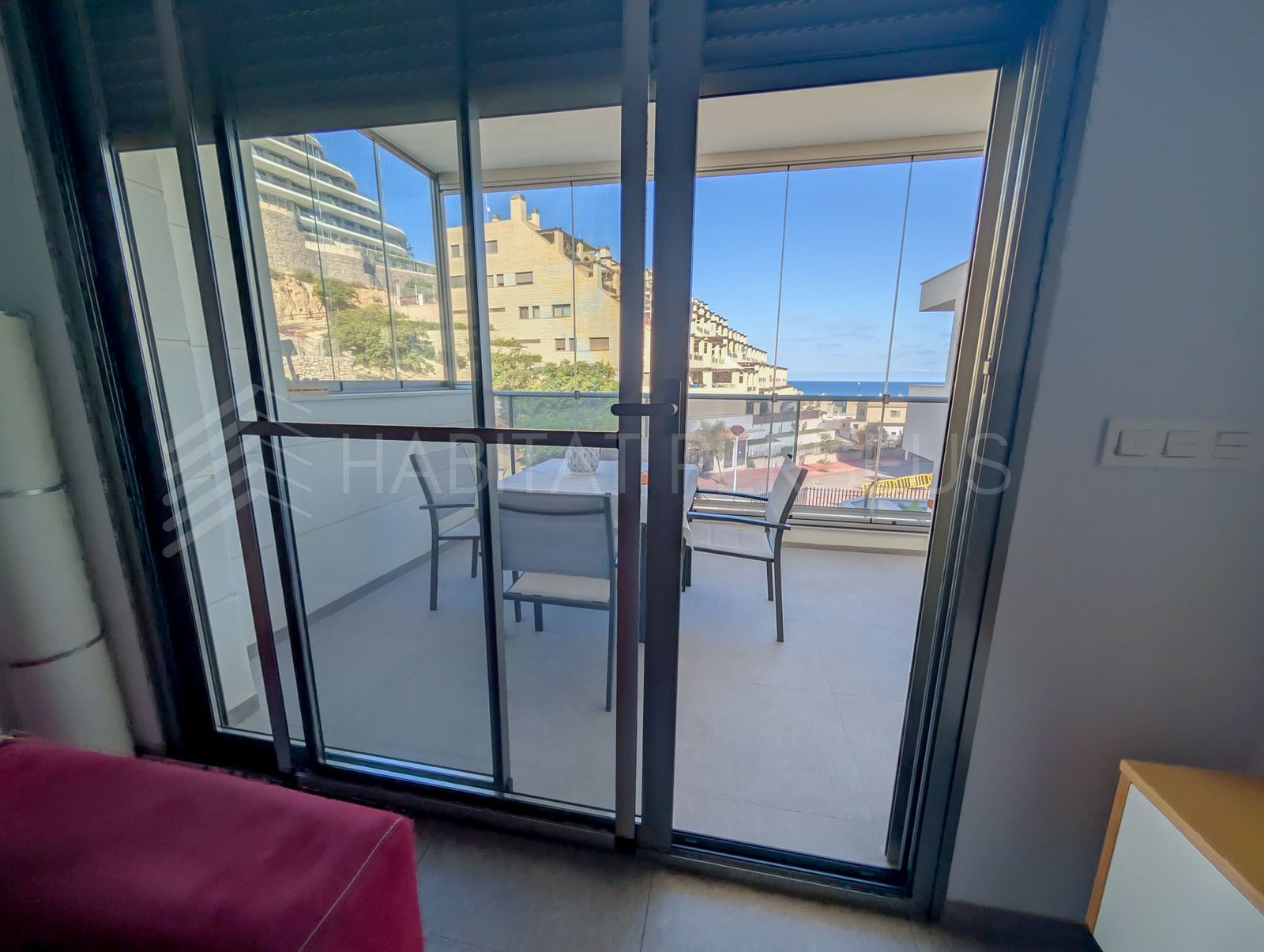 La terraza es uno de los espacios más especiales de la casa. Amplia y con cerramiento de cristales desplazables, permite aprovecharla todo el año, incluso en días ventosos, aislando el espacio sin perder la luz natural ni las vistas al mar.
