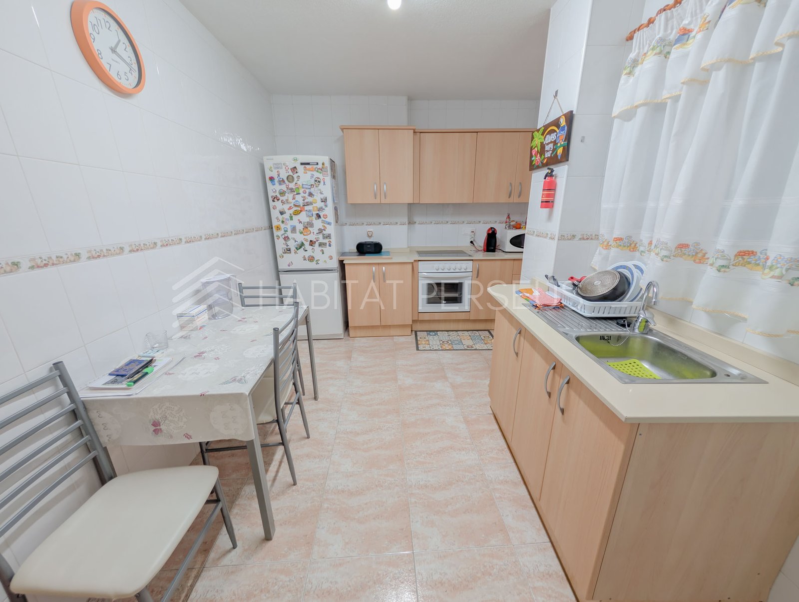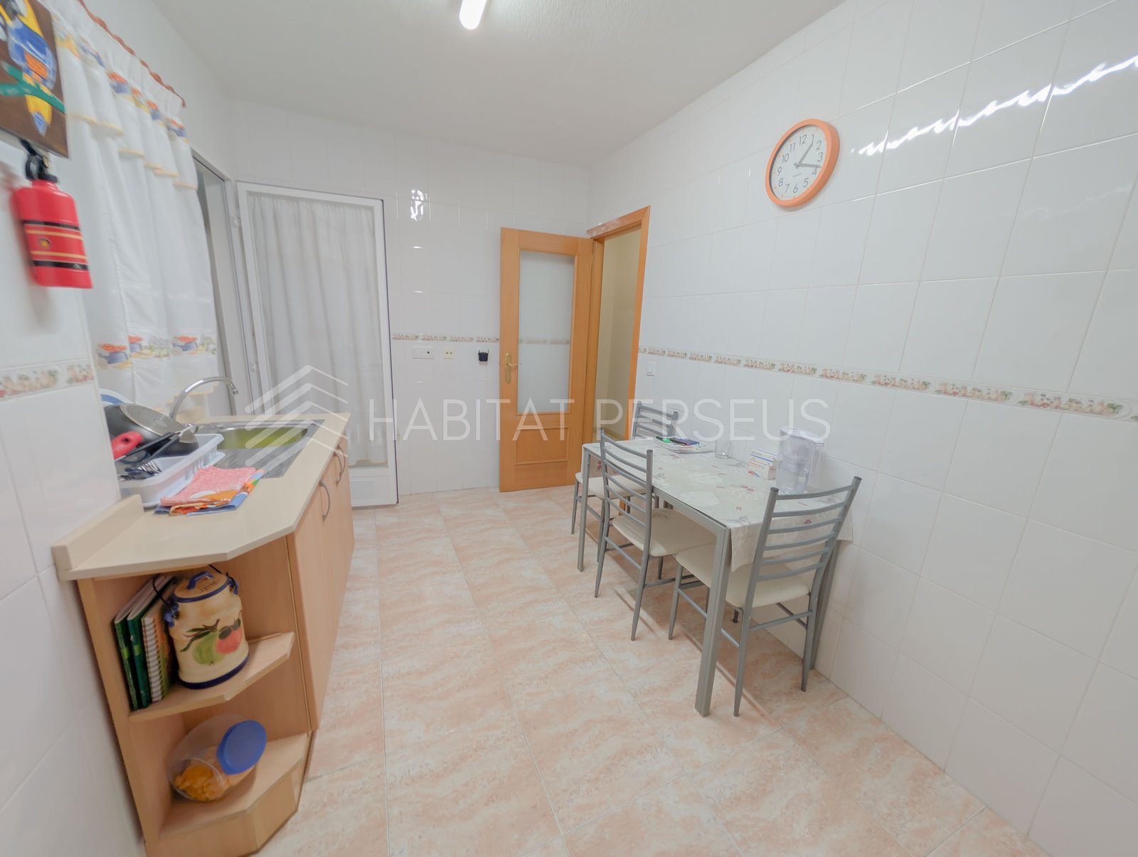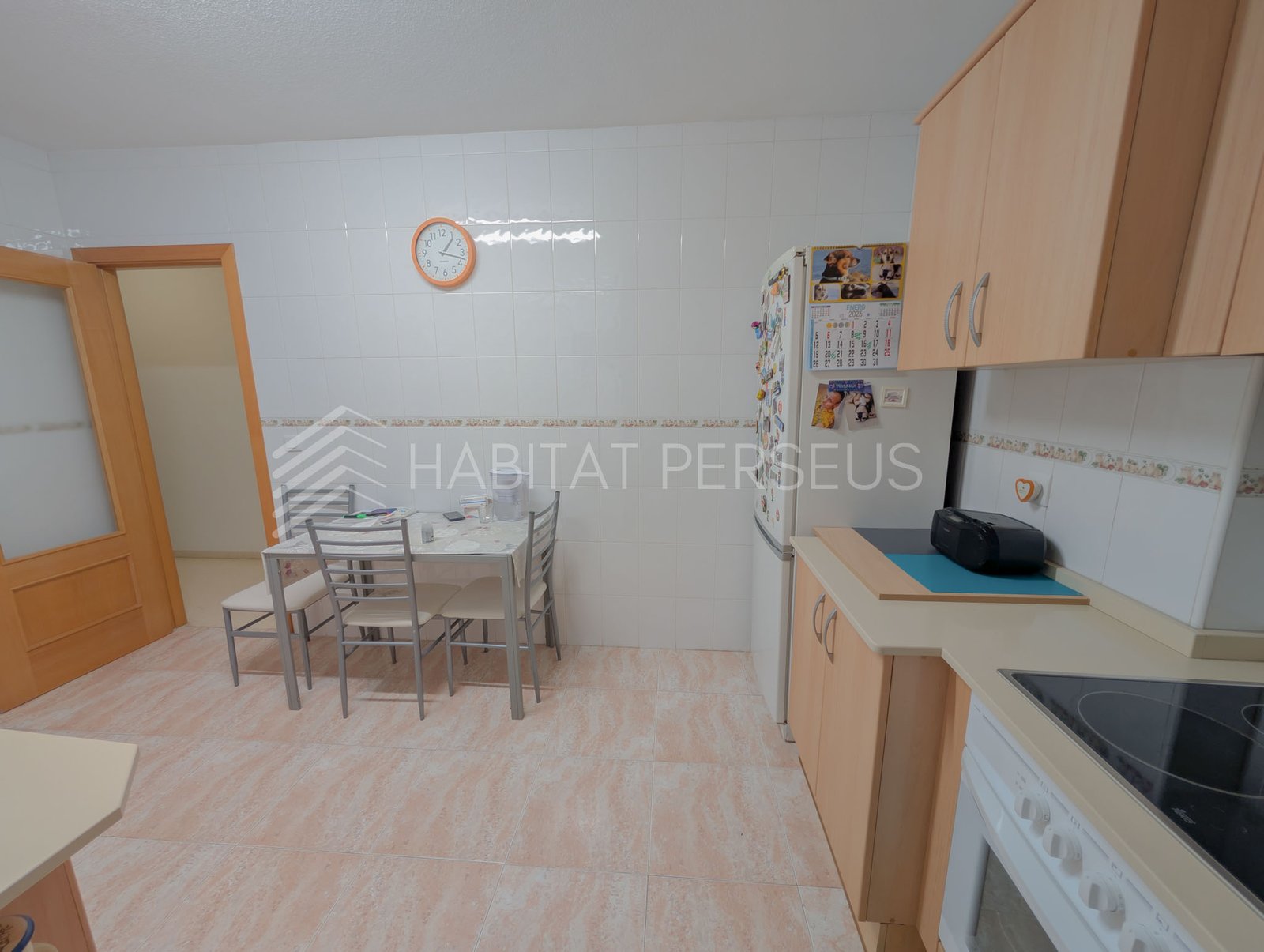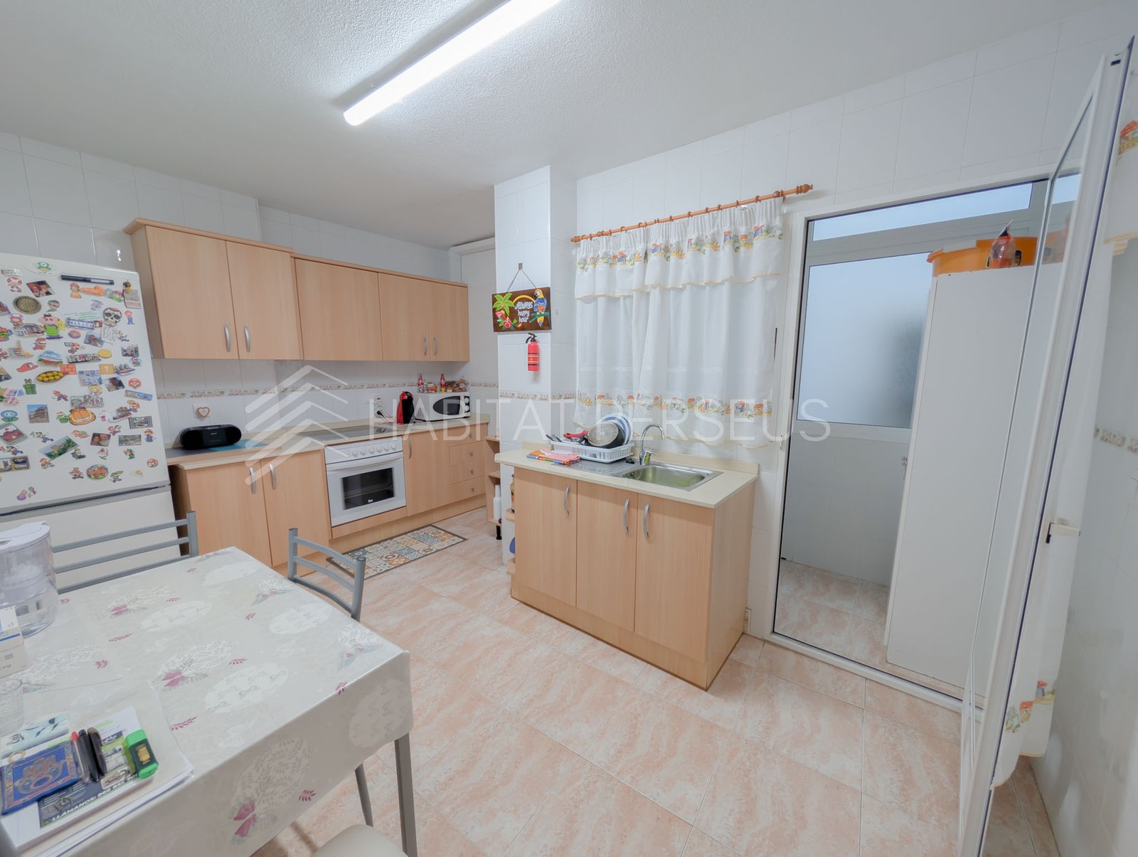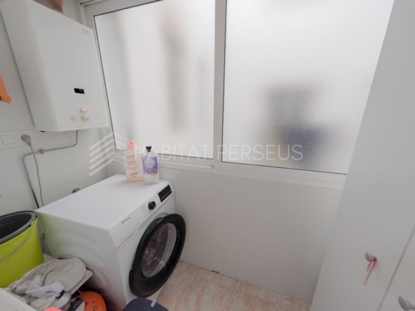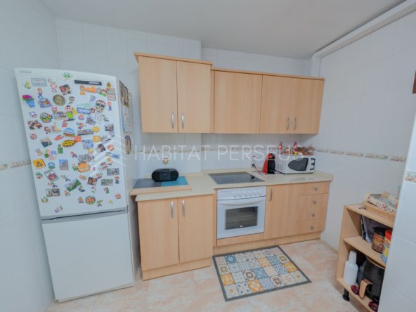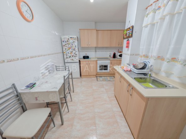La cocina es muy espaciosa y completamente equipada, ideal para el día a día. El piso se entrega semiamueblado, con algunos muebles que permanecerán en la vivienda y otros que el propietario se llevará. Desde la cocina se accede a una galería independiente donde se encuentra la lavadora y espacio extra de almacenamiento.